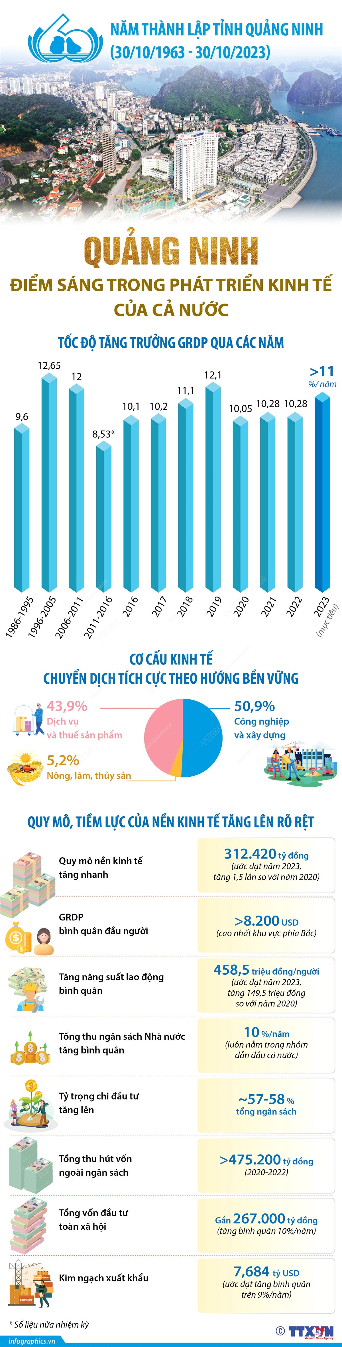 Trải 60 năm xây dựng và phát triển, Quảng Ninh từ một địa phương nằm trong tình trạng yếu kém, chủ yếu dựa vào sự hỗ trợ của Trung ương đã trở thành một trong những tỉnh công nghiệp, dịch vụ năng động, sáng tạo, đi đầu cả nước trên nhiều lĩnh vực, trở thành trung tâm đổi mới của Vùng đồng bằng Bắc Bộ, là cực tăng trưởng toàn diện của phía Bắc. 7 năm liên tục (2016-2022), Quảng Ninh đạt tốc độ tăng trưởng GRDP trên hai con số, tốc độ đô thị hóa đứng ở tốp đầu cả nước chỉ sau các thành phố trực thuộc Trung ương. Chất lượng tăng trưởng được cải thiện đáng kể quy mô, tiềm lực của nền kinh tế tăng lên rõ rệt, cơ cấu kinh tế chuyển dịch tích cực theo hướng bền vững hơn.