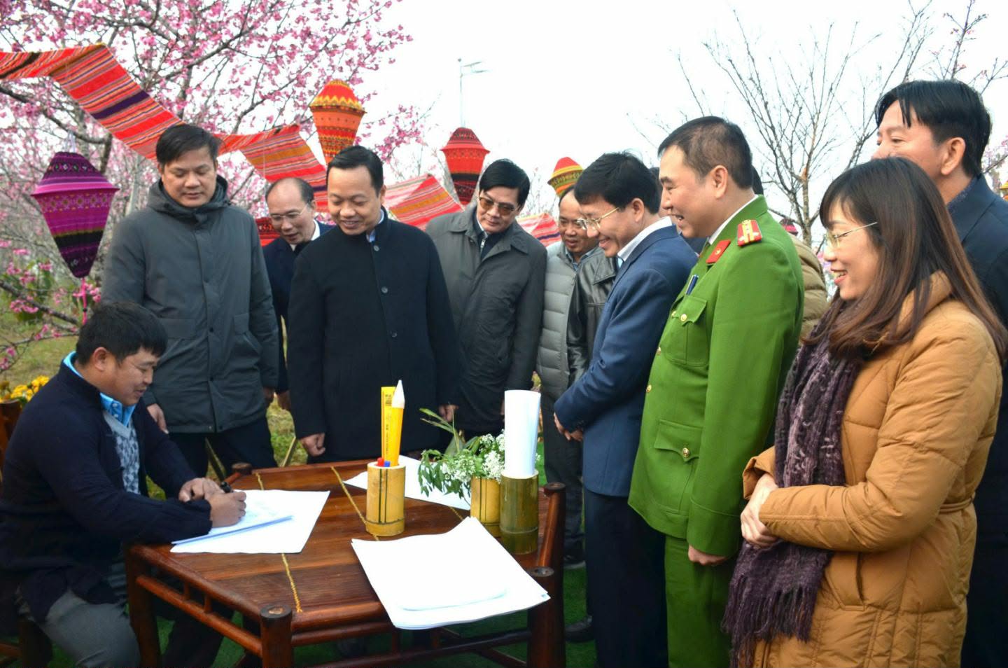 Bí thư Tỉnh ủy Trần Tiến Dũng tham quan gian trưng bày tại Lễ hội Hoa anh đào - xã Mường Phăng năm 2026.