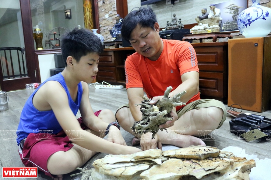 Nghệ nhân cây cảnh Nguyễn Tiến Dũng truyền nghề cho thế hệ trẻ - Ảnh: Tư liệu VNA