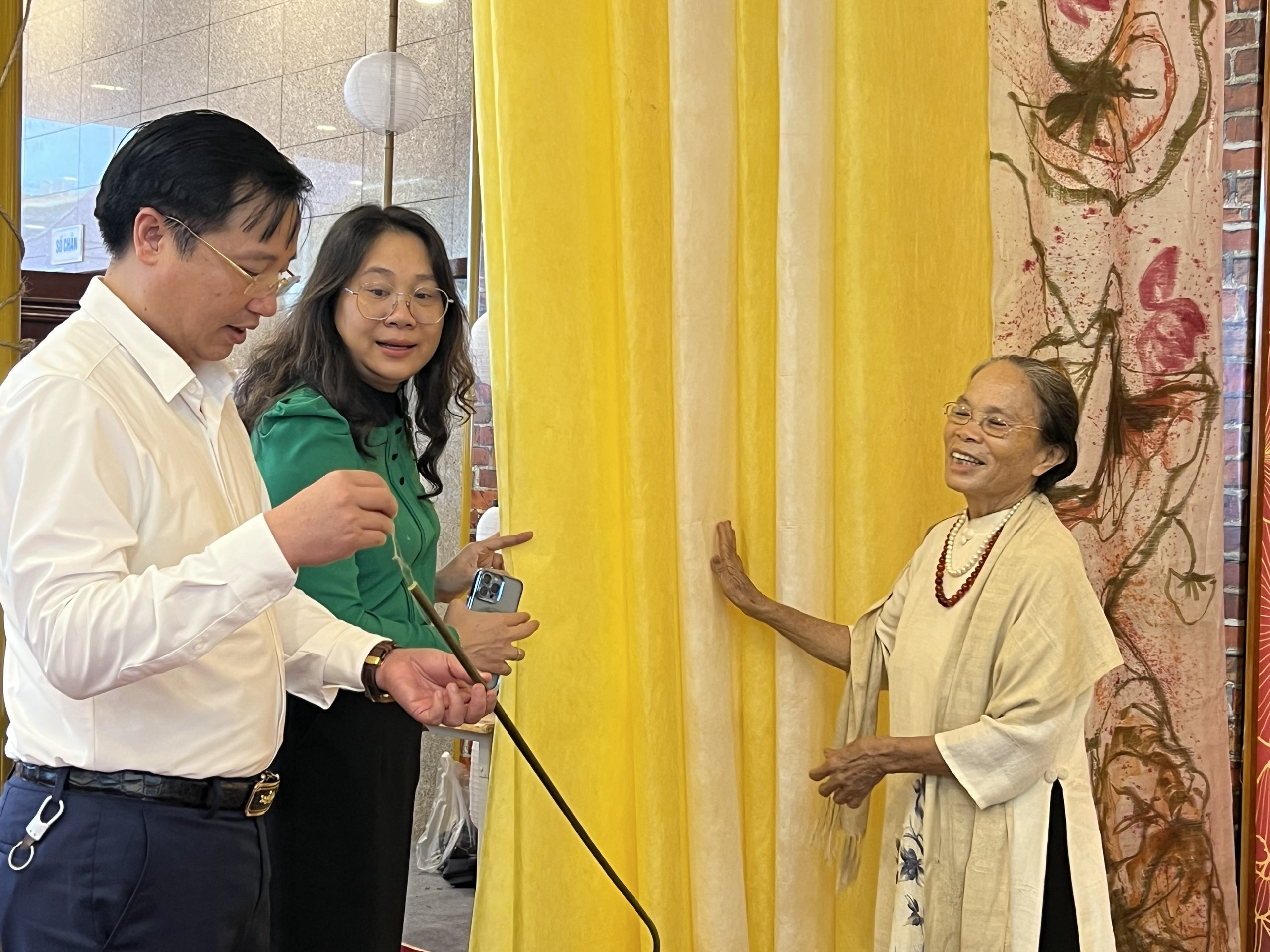 Ảnh: Nghệ nhân Phan Thị Thuận giới thiệu về sản phẩm khăn làm từ lụa tơ sen