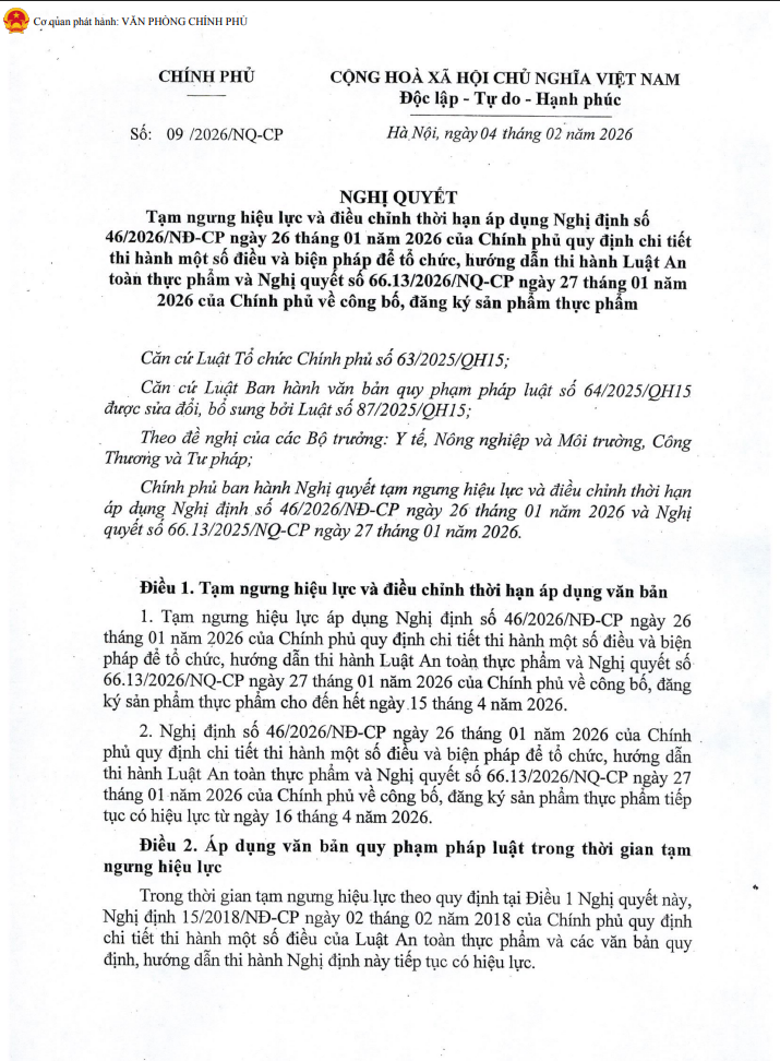 Chính phủ vừa ban hành Nghị quyết số 09 về việc tạm ngưng hiệu lực và điều chỉnh thời hạn áp dụng Nghị định 46 ngày 26/01/2026 quy định chi tiết thi hành một số điều và biện pháp để tổ chức, hướng dẫn thi hành Luật An toàn thực phẩm và Nghị quyết số 66.13 ngày 27/01/2026 quy định về công bố, đăng ký sản phẩm thực phẩm.